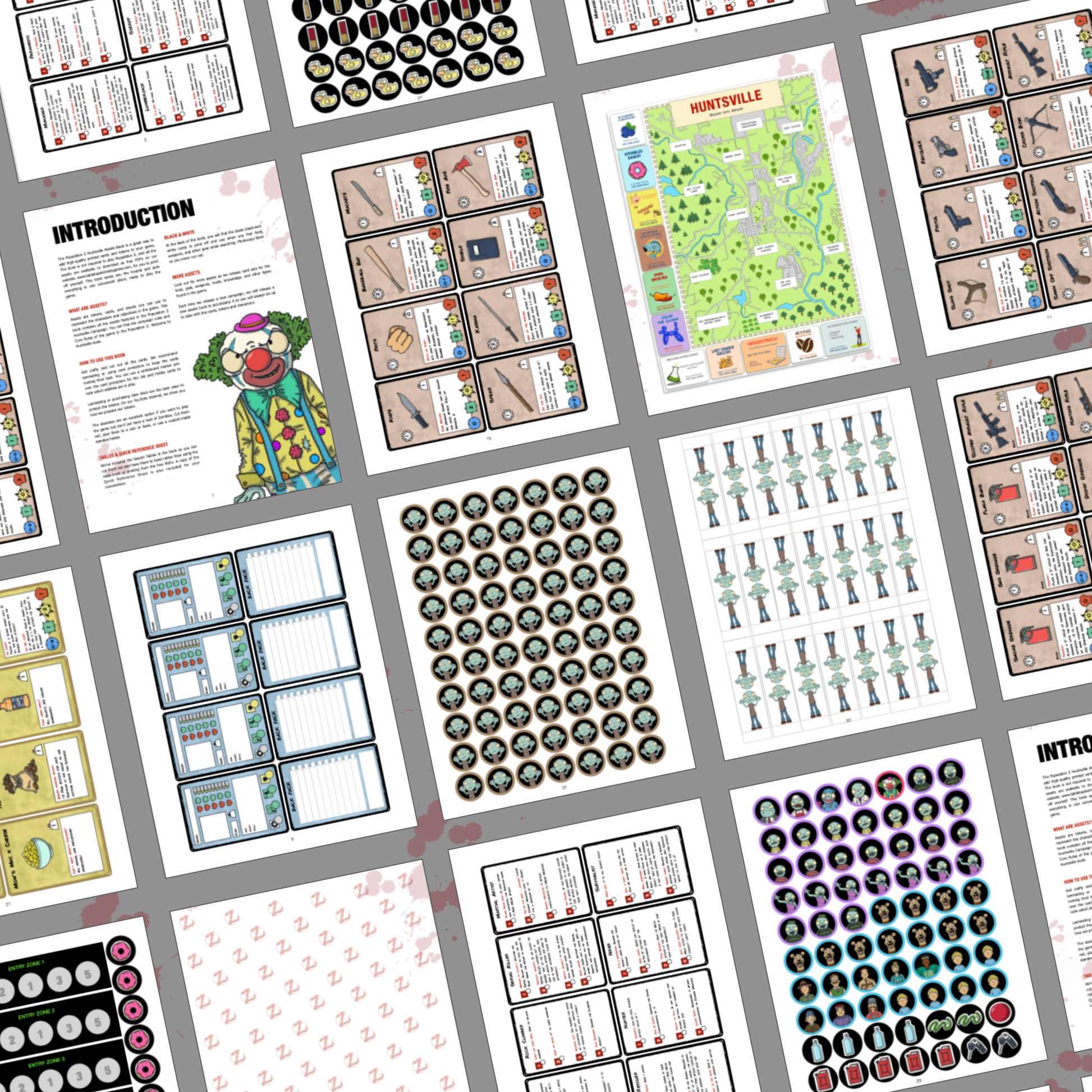 Enhance your journey through the zombie-infested world of Population Z with the Huntsville Campaign Asset Book. This comprehensive collection is the perfect companion to the core game, designed to bring your skirmishes to life with a mix of printed components.