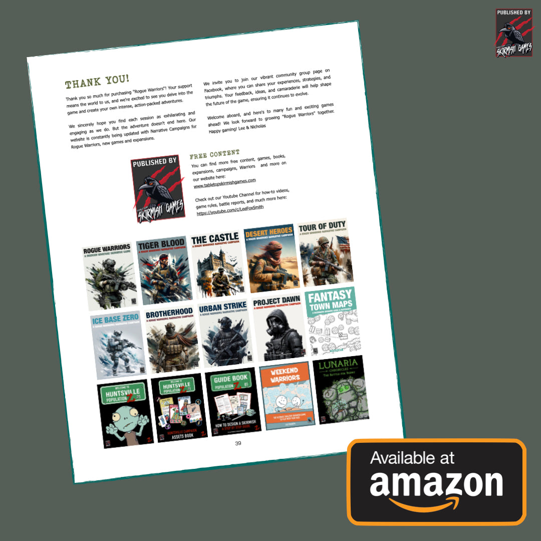 THANK YOU! - Thank you for taking an interest in Rogue Warriors. The game is heavily supported on our Tabletop Skirmish Games YouTube channel where you can watch how to play videos, guides, terrain craft, ask questions, and lots more. I can't wait to see you there!