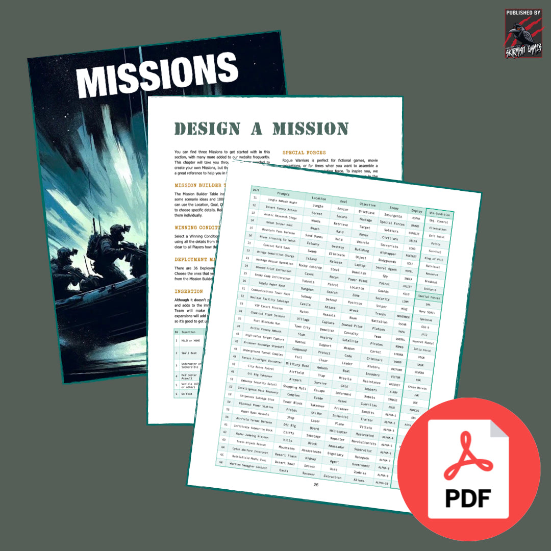 The mix of historical, contemporary, and fictional settings allows for an unparalleled variety of skirmish scenarios, movie recreations, and historical reenactments. Use the 'Mission Builder Table' to create 1000's of Missions for any era and theatre-of-war, with prompts, locations, enemies, objectives, winning conditions and 36 deployment maps. Rogue Warriors is miniature agnostic, too, so you can use your favourite 28mm miniatures or collections in scales from 15mm to 40mm.