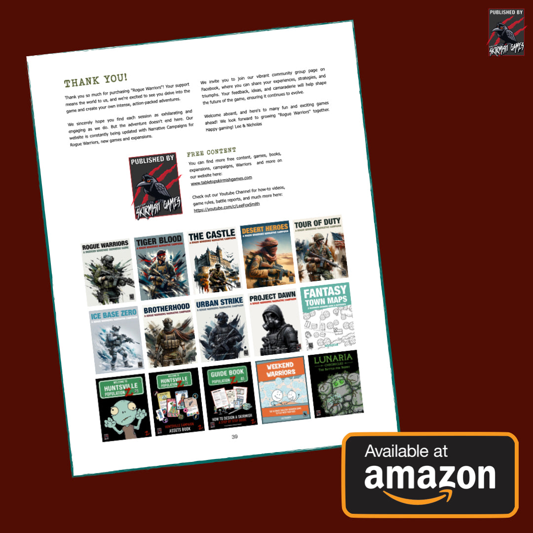 THANK YOU! - Thank you for taking an interest in Rogue Warriors. The game is heavily supported on our Tabletop Skirmish Games YouTube channel where you can watch how to play videos, guides, terrain craft, ask questions, and lots more. I can't wait to see you there!