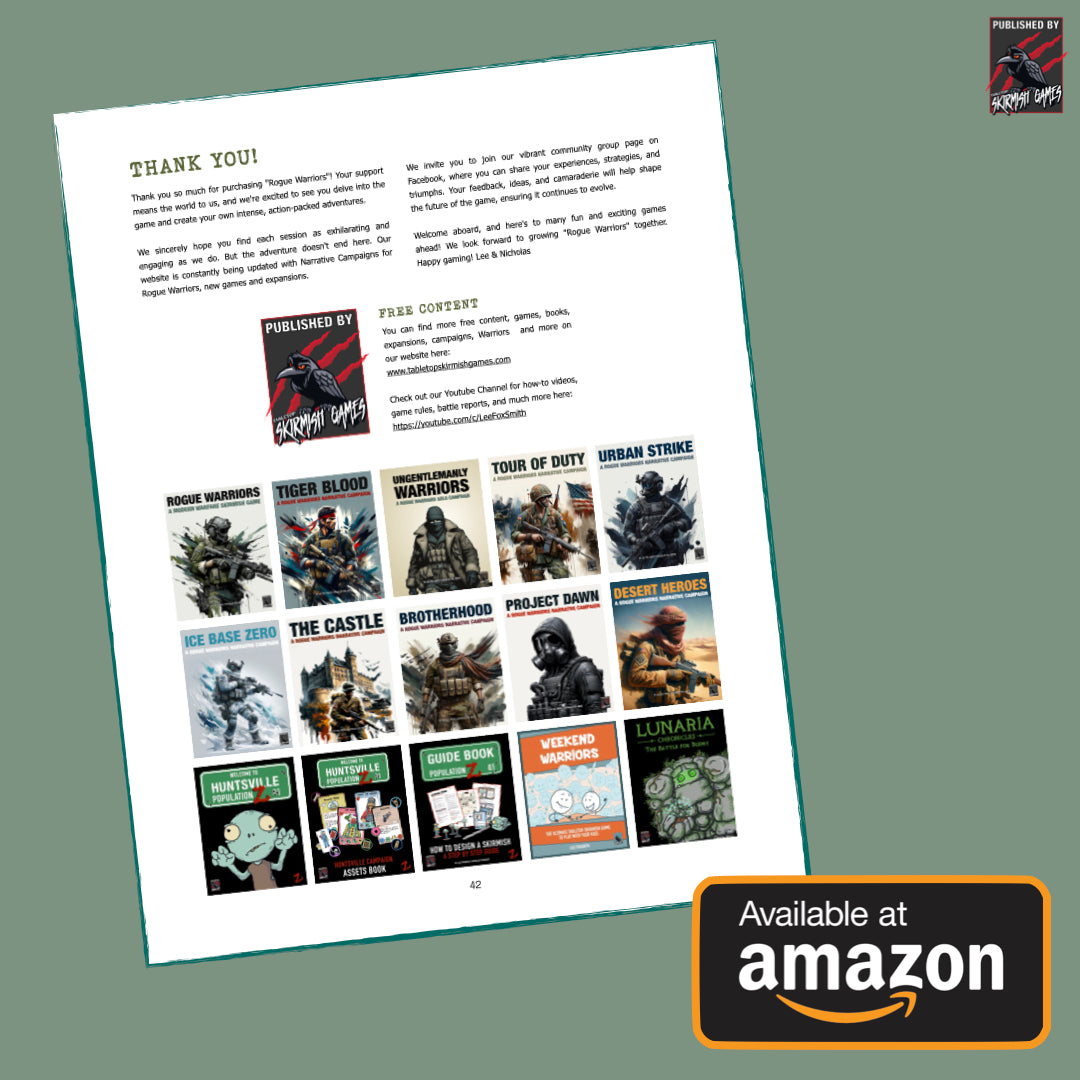 THANK YOU! - Thank you for taking an interest in Rogue Warriors. The game is heavily supported on our Tabletop Skirmish Games YouTube channel where you can watch how to play videos, guides, terrain craft, ask questions, and lots more. I can't wait to see you there!