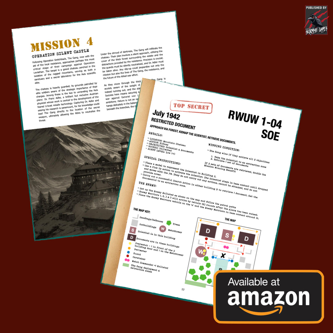 As darkness envelopes Europe, a special forces team of elite Warriors emerges to challenge the Axis's might, engaging in operations that blur the lines of conventional warfare. Ungentlemanly Warriors invites players to step into the boots of these daring operatives known simply as 'The Gang' or take command of the Axis special forces, The Schwarzschild, led by the sinister General Friedrich von Luger.