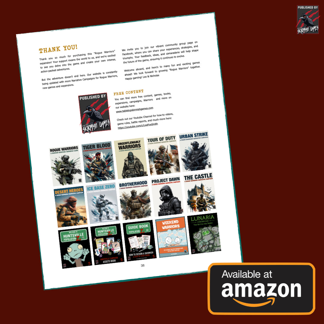 THANK YOU! - Thank you for taking an interest in Rogue Warriors. The game is heavily supported on our Tabletop Skirmish Games YouTube channel where you can watch how to play videos, guides, terrain craft, ask questions, and lots more. I can't wait to see you there!
